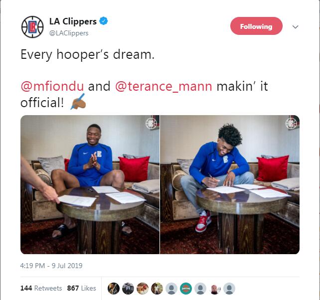 24直播网7月10日讯 来自官方的消息,快船官方宣布与2019年新秀菲翁杜-卡本盖莱和特伦斯-曼签约。由于球队政策,相关合同条款并未被公布。