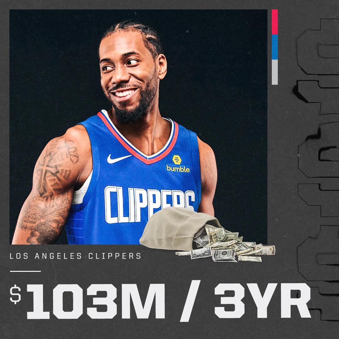 同样是在今天,快船官方宣布正式和莱昂纳德签约,根据之前的报道,双方将会签下4年1.42亿美元顶薪,但今天双方正式签下的却是一笔3年价值1.03亿美元的合同,其中第三年为球员选项,比之前的合同少了一年。