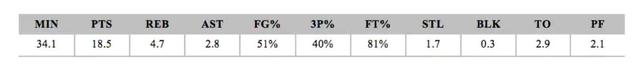 3、出色的定点投手,平均每次接球跳投能够得到1.636分,超过99%的球员