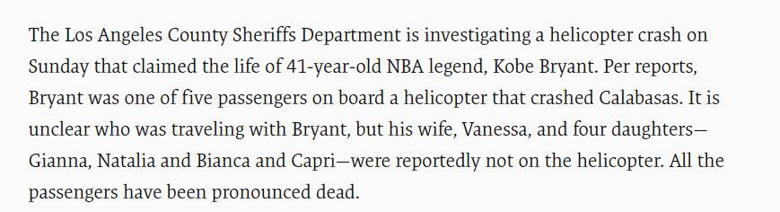 据NBA名记报道,科比是陪Gigi前往一场客场的比赛,直升机上还有另一名球员及其父母,卡拉巴萨斯市官方人员随后确认这一报道。