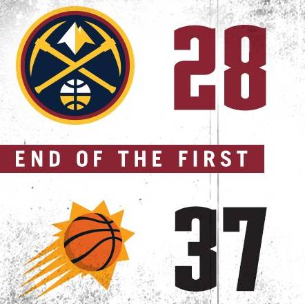 掘金开局反客为主迅速找到手感,克雷格和穆雷命中三分,帮助球队取得领先。不过,太阳随后亦进入状态,艾顿在内线连投带罚攻下4分,布克和乌布雷命中三分,太阳把比分追至14平。此节中段,掘金突然哑火,陷入了3分钟的得分荒;太阳则延续着手感,布克再中三分,艾顿冲击篮筐砍下4分,两人率领太阳打出9-0,以23-17反超比分。掘金经过暂停调整后由约基奇篮下得手打破僵局,紧接着穆雷命中三分,但太阳的布里奇斯和乌布雷马上回敬三分,帮助太阳以31-24继续领先。此节末段,布克再连投带罚砍下4分,太阳得以37-28领先9分结束首节。