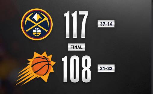 太阳坐镇主场迎战掘金,此役掘金的米尔萨普复出,小波特则因脚踝伤势继续缺阵。首节布克、乌布雷连中三分,艾顿在篮下频频得手,内外开花的太阳以37-28取得领先,但太阳在次节命中率下滑,约基奇带领掘金打出高潮,在半场结束时以55-54反超比分。易边再战,穆雷在第三节连续命中三分,帮助掘金保持着领先。末节布克和艾顿率领太阳展开疯狂反扑,不过穆雷和约基奇在关键时刻站出来连续得分还以颜色,掘金得以压制住太阳的反扑势头。最终,掘金在客场以117-108力克太阳,取得3连胜。