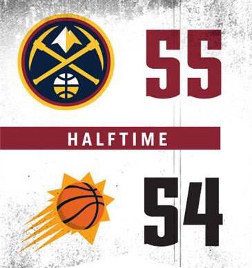 次节回来,太阳的轮换阵容突然断电,在前2分半钟里连续不中没有得分。掘金捉住机会追分,米尔萨普、哈里斯和莫里斯轮番杀伤内线得手,掘金打出8-0把比分追至36-37,直接打停太阳。暂停之后,太阳派回主力阵容,艾顿和乌布雷冲击篮筐得分为球队止血,不过米尔萨普和迪奥普马上有所回应,双方紧咬比分。之后太阳越投越顺,卡梅伦-约翰逊命中三分,艾顿在篮下连续进攻打成砍下6分,帮助太阳以54-45重新建立起领先。然而,太阳在此节最后3分钟再次出现状态起伏,他们连续打铁没有得分;掘金则连续造犯规,约基奇、哈里斯和格兰特接连两罚全中,多点开花的掘金打出一波10-0,在半场结束时以55-54反超比分。