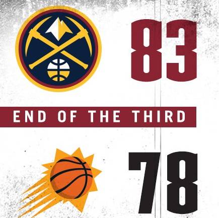 易边再战,太阳找回手感,艾顿篮下得手,乌布雷命中三分,但掘金的穆雷马上里突外投连得4分回敬,约基奇亦捉住错位机会碾压内线得分,掘金以63-59保持着领先。此节中段,掘金失误增多,太阳的乌布雷反击得手,约翰逊命中三分,帮助太阳把比分追至68平。不过,穆雷之后突然爆发,他个人独中3记三分,率领掘金打出10-2的攻击波,以81-73重新建立起领先。此节最后1分钟,卢比奥突破造犯规两罚全中,约翰逊突破打成2+1,太阳得以止血,以78-83咬着比分结束第三节。