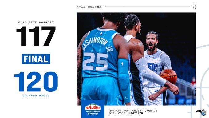 末节,开局罗齐尔上篮得分,之后又连中两记三分,黄蜂直接送出一波10-0,将魔术打停。回来后,格拉厄姆由里外开花连续得分,马丁外线远投,而魔术在前4分钟未能得到一分,被打出23-0,比分被反超。随着奥基基的篮下强打得分,打破了魔术的僵局,之后安东尼外线得分,魔术打出7-0,在比赛最后时刻,安东尼上篮得分完成反超,而黄蜂的替补们没能投进绝杀球。最终魔术以120-117险胜黄蜂。