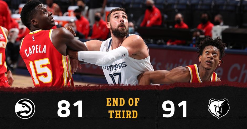 次节回来,克拉克和阿伦的两记三分帮助灰熊再度拉开比分,老鹰多次冲击内线并频频走上罚球线,随着博格丹诺维奇也在外线命中三分,老鹰一度将分差缩小至6分。末段灰熊也开始冲击内线并在此做出回应,而阿伦的压哨三分帮助灰熊61-51领先老鹰结束上半场。 第三节雷迪什和特雷-杨冲击油漆区拿分,随后雷迪什又在外线送出三分球,老鹰开局再送7-3的攻势追赶比分。灰熊方面依靠着莫兰特和安德森的两记三分及时稳住局面,老鹰也不断做出回应紧咬着比分。三节战罢,灰熊仍然手握10分领先。