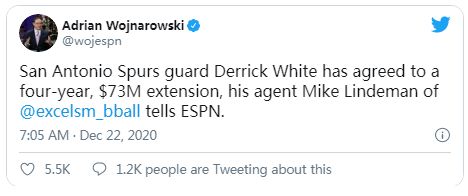 德里克-怀特与马刺达成4年7300万美元的续约协议