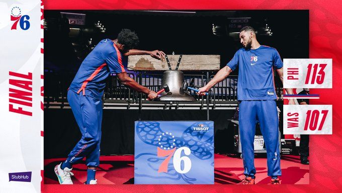 末节,科尔克马兹先命中三分,接着恩比德罚球再追4分,威少连续跳投命中稳住局势,恩比德继续在中距离得分,76人将比分追成88平。比尔三分命中,史密斯罚球两球命中,恩比德连投带罚继续砍分,威少上篮也打成2+1,比尔外线再来三分,西蒙斯接连杀入内线帮助76人101-99反超比分。布莱恩特连续在篮下打进两球,76人也选择轮番杀入内线拿分,比尔撤步跳投命中,在还剩33秒时奇才仍旧落后2分。西蒙斯跑位接球暴扣,奇才三分未中,最终76人依靠罚球逆转奇才。比分113-107。