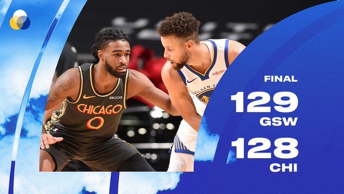 最后一节,普尔上来命中三分,勇士一度将比分追至100-100平。不过,拉文之后发力,频频突破得手并命中三分,个人连得7分,带领公牛以110-102重新取得领先。虽然库里和李随后命中三分紧咬比分,但是投出手感的拉文再突破得分,科比-怀特命中三分,帮助公牛以121-112压制住勇士。到了比赛末段,勇士展开反击,库里连续突破得手并命中三分,砍下10分率领勇士在最后一分钟扳平比分。最后时刻,拉文强突跳投命中,公牛重夺领先。李在最后一攻站出来命中三分,勇士成功绝杀公牛以129-128获得赛季首胜。