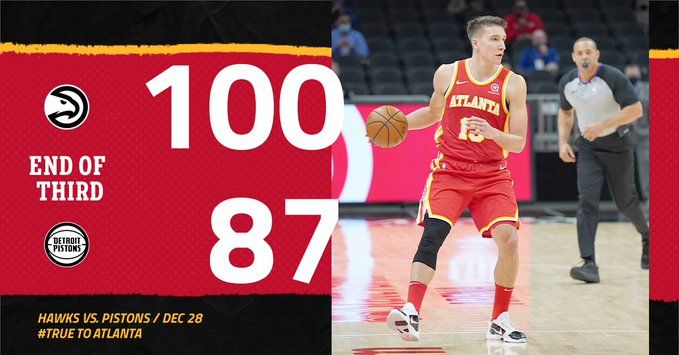 两队换边来到第三节,格兰特上篮率先得分,接着卡佩拉暴扣回应,前3分钟,双方都是轮番得分,分差维持在10分左右。之后雷迪什、海斯等人为活塞连续得分,将分差缩到剩下4分,博格丹底角两个三分稳住局势,约什-杰克逊也连续反击得手,活塞77-81只落后4分。 特雷-杨造成三分犯规全部罚进,休特反击打进,虽然活塞此后继续杀入内线,但老鹰外线火力持续输出,隆多命中压哨三分,三节结束,老鹰100-87继续领先。