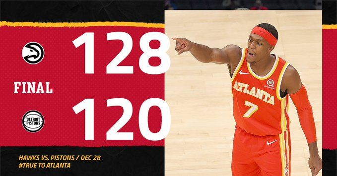 末节,希尔开局命中三分,艾灵顿抛投命中,柯林斯接连抢到进攻篮板拿分,老鹰打出一波高潮继续扩大优势到24分。此后活塞连续3个三分命中回敬一波15-0。柯林斯顺下完成暴扣,普拉姆利强势补扣,特雷-杨再罚两球,格兰特三分弹框而入。特雷-杨回敬三分稳住局势,普拉姆利空接再次暴扣,格兰特追身再中三分,活塞117-122只落后5分。最后,活塞采用犯规战术,但老鹰罚球稳健,以128-120击败活塞。