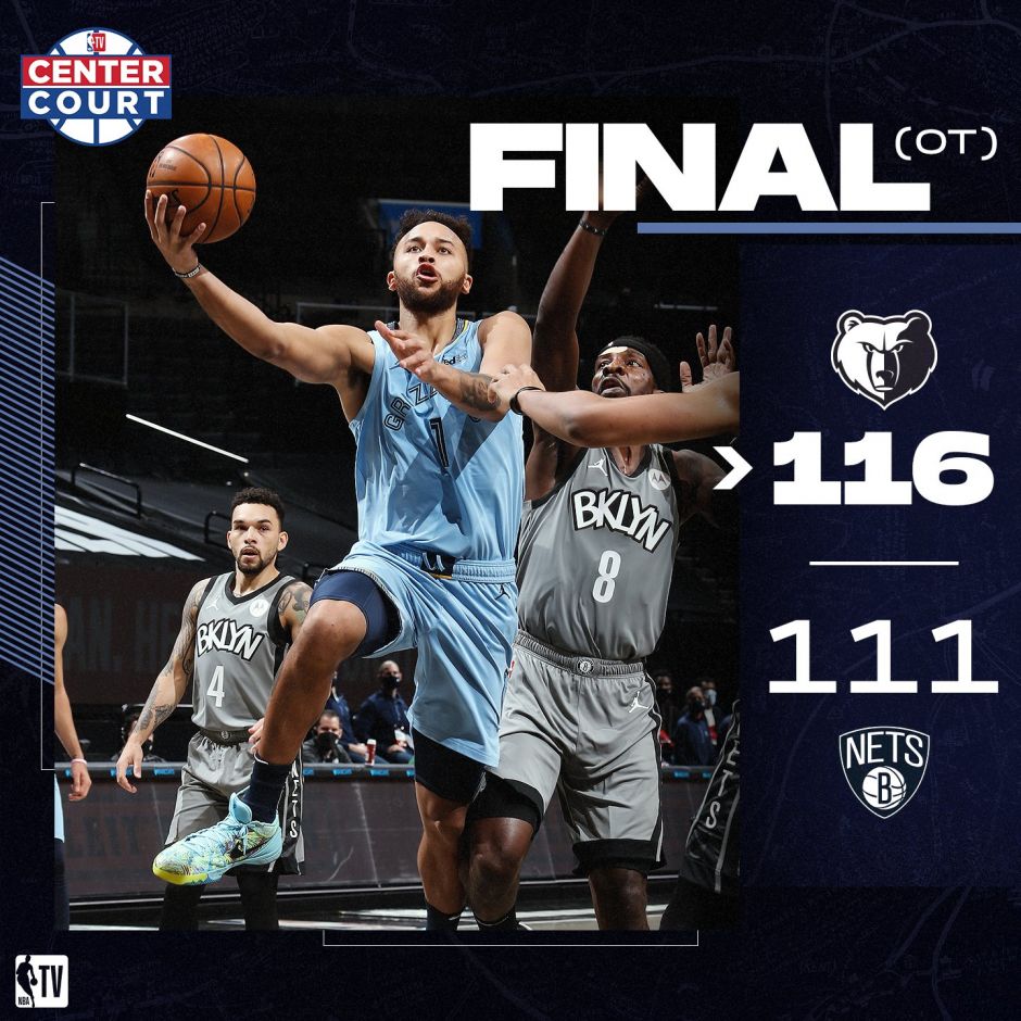 加时赛开始,瓦兰扣篮得手为灰熊先下两分,篮网队则是多次进攻打铁,随后勒韦尔抢断快下暴扣扳平比分,琼斯上篮命中后勒韦尔三分再进反超比分,不过灰熊克拉克补篮命中帮助球队反超比分,最后一攻篮网哈里斯三分未能命中,安德森面对犯规战术稳稳罚进,最终灰熊116-111击败篮网。