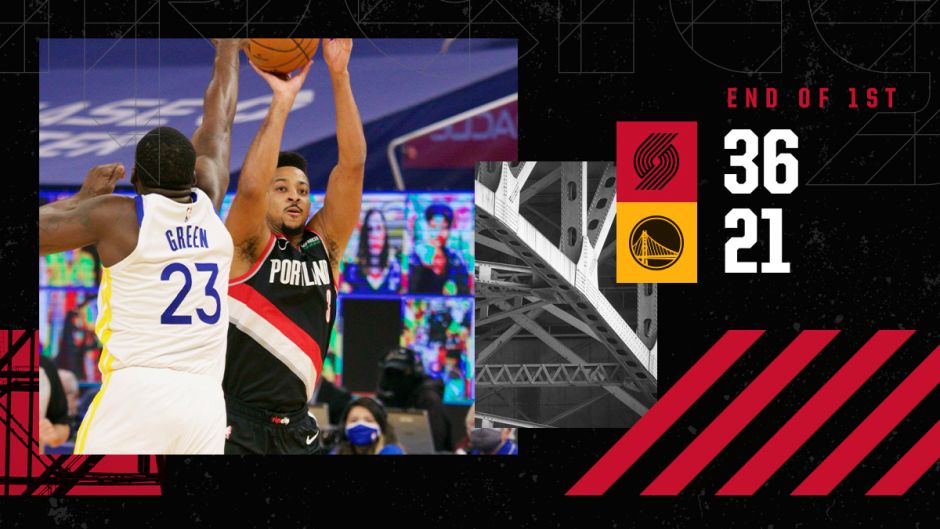 首节上来,勇士新秀怀斯曼就凭借一记长两分拉开了比赛的序幕。但是开拓者首节在外线的手感愈发火热,多点开会连中四记远投在场上取得领先,在努尔基奇强突篮下抛投得手后场上分差达到两位数,经过暂停之后利拉德借助掩护上篮打成2+1,随后勇士就陷入了长达了3分钟的得分荒,最终贝兹莫尔上篮终于打破了僵局。但是CJ-麦科勒姆的火热状态仍在延续,在连得8分之后开拓者将分差扩大至20分。在首节结束之后,开拓者36-21领先勇士。