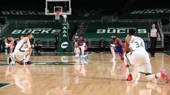 然而,当卫冕MVP字母哥为篮网队获得第一个球权后,两队包括场边的教练组都跪了下来。在随后活塞队的一次进攻中,当布雷克-格里芬持球时,他们又重复了这一行为,两队再次跪下。