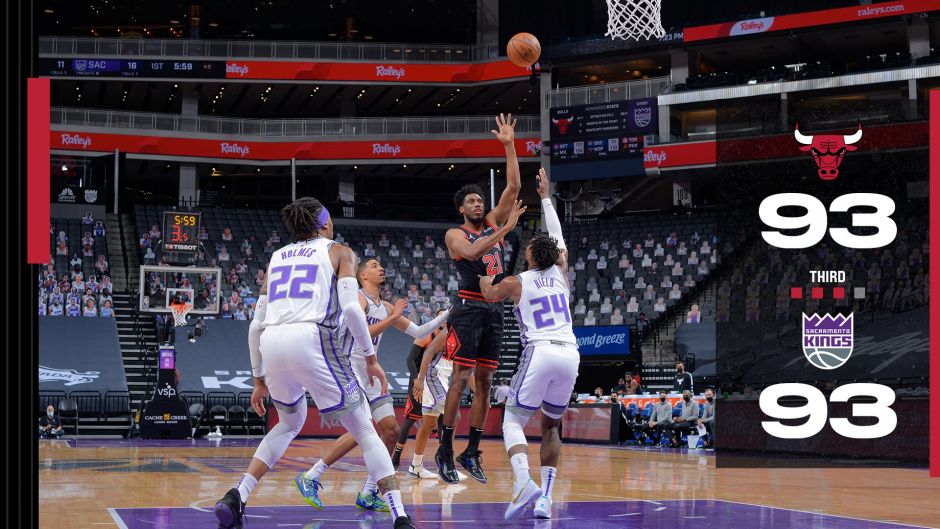 到了第三节,国王这边巴恩斯突破率先拿分,拉文则在反击中远投得分,这波对决中国王一直稳住微弱领先,巴格利的两记三分带队掀起进攻,节中这一波12-5的攻势拉开比分。然而末段公牛又一次追上比分,坦普尔命中止血三分,加上赛迪斯-杨连续禁区拿分,刚刚拉大至9分的劣势很快就被追上。末段进攻公牛依靠怀特连续拿分实现反超,不过别利察两罚全中追平比分结束第三节。