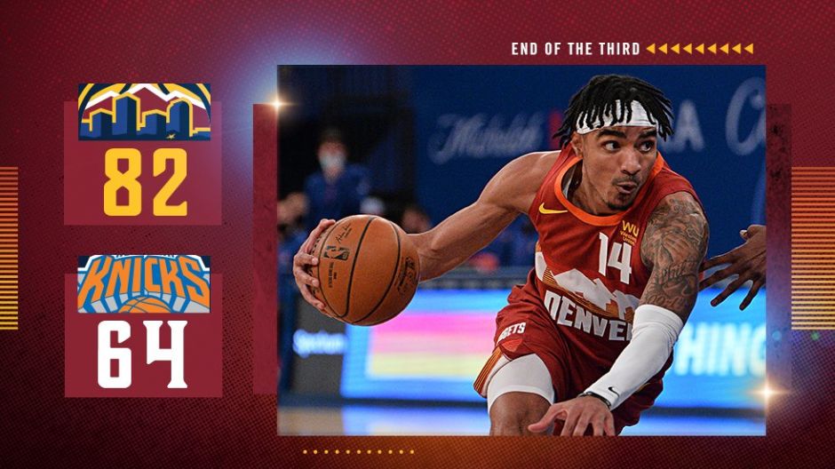 第三节比赛,兰德尔上来外线命中,为尼克斯率先得分,而掘金靠着哈里斯暴扣,继续保持两位数领先。小佩顿连投带罚连得6分,帮助尼克斯继续追赶比分,可是掘金毫不留情,哈里斯再中三分,分差仍然保持在20分。来到本节中段,兰德尔两分打进,布洛克再中两分,分差来到14分。暂停回来,约基奇联手莫里斯内外开花连得5分,再次扑灭尼克斯的追赶势头。末段,约基奇命中2分,罗宾逊回应2分,结束第三节。三节战罢,掘金以82-64领先掘金。