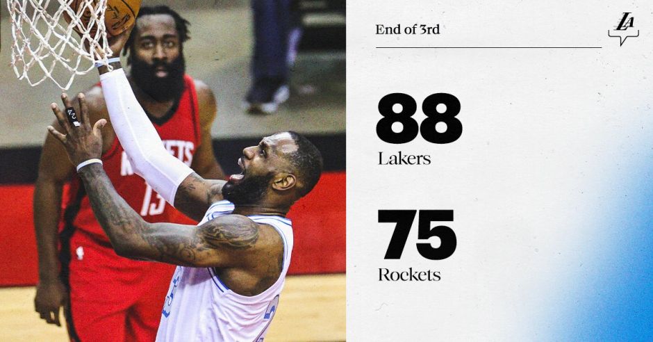 第三节比赛,湖人继续外线发炮,詹姆斯命中三分,火箭方面努瓦巴三分回应。湖人持续火热状态,小加索尔命中三分后,在下个回合四分卫传球助波普完成快攻上篮得分。而火箭手感仍然冰凉,波普再次命中三分,分差来到20+。伍德连得7分帮助火箭止血,接着哈登再中3分,分差缩至16分。暂停回来PJ-塔克执行罚球得1分,哈登突破上篮打中,分差缩至13分,这段时间火箭打出11-0攻势。戴维斯造犯规罚球得分帮助湖人稳住局势。本节末段,火箭持续追分模式,哈登突破上篮命中,戈登造犯规罚球得分,可是湖人也不甘示弱,霍顿-塔克劈扣点燃气势,库兹马命中三分,帮助球队持续领先。三节战罢,湖人以88-75领先火箭13分。