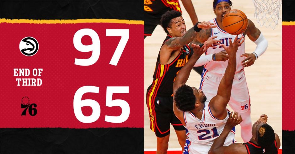 第三节比赛,特雷-杨外线发炮加中距离加快攻上篮连得7分,率先为老鹰打开局面。这期间76人一分未得,随着卡佩拉造犯规罚球得分,一波9-0开局送给76人。马克西突破上篮打中,为76人打破僵局。随后乔引领一波7-0攻势,乔命中三分,马克西后仰跳投命中,布拉德利突破得手。而老鹰丝毫不慌,特里-杨再进三分,稳住局势。随着古温命中三分,分差来到30分,结束前,费尔南多补篮得手,老鹰完全掌控场上的局势。三节战罢,老鹰以97-65领先76人32分。