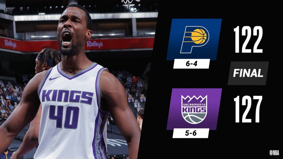 末节,霍姆斯和哈利伯顿相继命中远投,国王连得六分后场上分差再次达到两位数,J-霍勒迪底角射进三分终于给出回应,巴恩斯强突篮下打成2+1,之后奥拉迪波站了出来,先是突破上篮得手,随后又抢断直接射进追身三分打停国王,调整过后国王依旧没能得分,步行者一波8-0追平比分,比赛悬念保持到了最后,关键时刻希尔德底角射进三分帮助国王占据主动,步行者没有再获得机会,最终国王127-122力克步行者,结束连败。