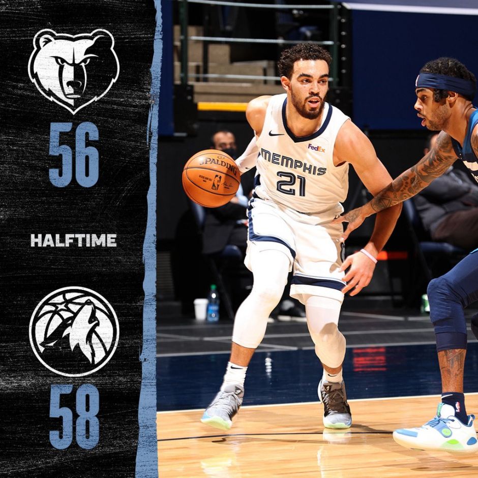 第二节比赛,双方单节比分战成29平,两队比分交替领先多次打平,分差维持在一两个球之间,灰熊的克拉克先站出来在内线得分到手,替补上场的梅尔顿、阿伦上场都有不错的表现,帮助球队追分。森林狼这边唐斯、拉塞尔和比斯利三人轮番进攻得分,在他们三个人的带领下森林狼始终占据场上主动,但其它球员发挥一般。半场战罢,森林狼58-56领先灰熊2分。