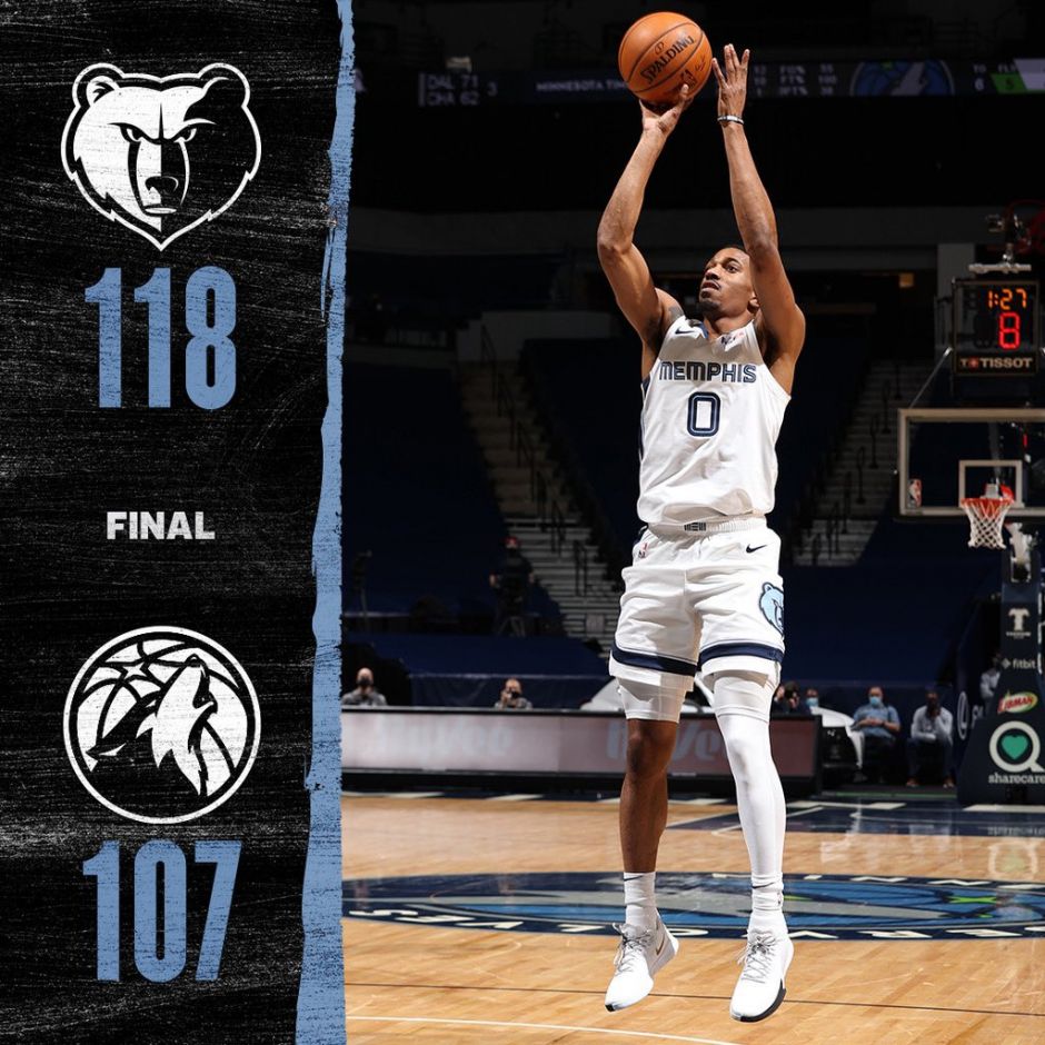 最后一节,灰熊的阿伦联手狄龙-布鲁克斯一上来命中3记三分,紧接着克拉克强突打成2+1,灰熊打出一波14-0的高潮,一举以94-92反超比分。森林狼随后清醒过来,比斯利反击打成2+1为球队止血,但是灰熊延续手感,安德森连中2记三分,帮助灰熊把领先扩大到104-96,直接打停森林狼。暂停之后,比斯利为森林狼命中三分,不过梅尔顿和克拉克连续突破得分还以颜色,灰熊保持着领先。比赛末段,虽然拉塞尔和唐斯联手拿下4分,但是瓦兰丘纳斯马上连得4分回敬,最终,灰熊以118-107逆转森林狼,取得3连胜。