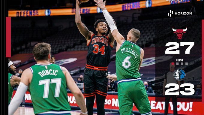 比赛开始后,两边展开对攻大战,考利-斯坦和东契奇连续在内线打成,温德尔-卡特命中三分,东契奇连续射进三分,个人连得8分半帮助独行侠迅速建立起领先。经过一番暂停调整过后,公牛队逐渐找到状态,加福德栏杆上篮得手终于实现反超,东契奇不满判罚吃T,两队明显加大了防守强度,场上哨声频频,卡尔马宁频频在内线造成犯规,波尔津吉斯低位转身上篮打成2+1,赛迪斯-杨接球抛投命中。首节打完,公牛以27-23领先独行侠4分。
