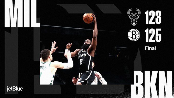 NBA常规赛:篮网125-123险胜雄鹿,KD、哈登合砍64+15+18!