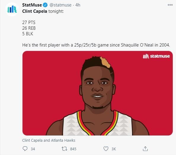 此役卡佩拉也一战创造两新高+三纪录,26个篮板球是职业生涯新高,5个盖帽是赛季新高,职业生涯最高盖帽是6个。第一项纪录是,卡佩拉成为2004年奥尼尔后第一位拿下至少25分+25篮板+5盖帽的球员。
