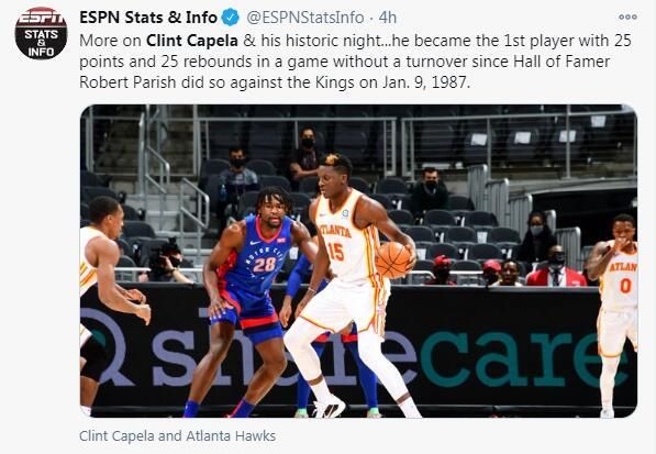 第三项:卡佩拉此役拿下27+26+5帽+0失误,成为自1987年罗伯特-帕里什对阵国王后第一位在比赛中得到至少25分25篮板没有失误的球员