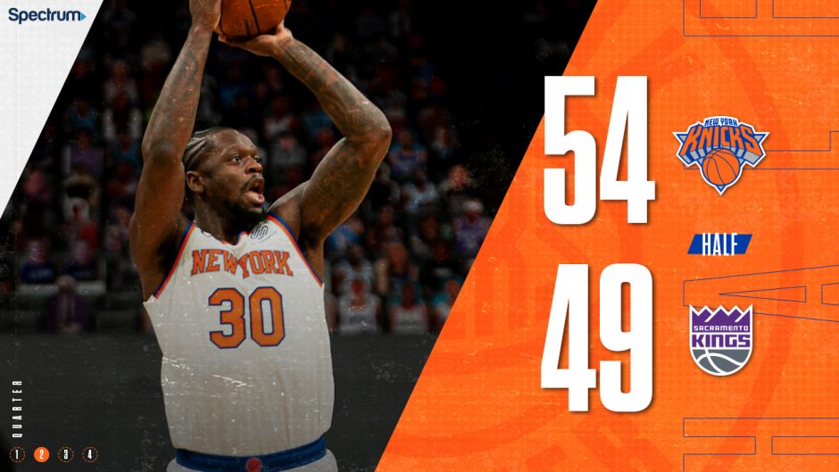 第二节,伯克斯突破上篮完成2+1,而国王哈利伯顿三分命中,两队互不相让,梅图跟进完成扣篮,诺克斯自投自抢得到2分,托平补扣得手,本节后半段两队得分效率开始下降,米切尔-罗宾逊底线接球完成暴扣,兰德尔制造犯规罚球为尼克斯扩大领先,而国王这边随着巴格利勾手命中,分差来到一分,佩顿2+1打成,尼克斯继续保持领先,随后巴恩斯三分命中,随着米切尔-罗宾逊完成扣篮。半场战罢,尼克斯54-49领先国王。