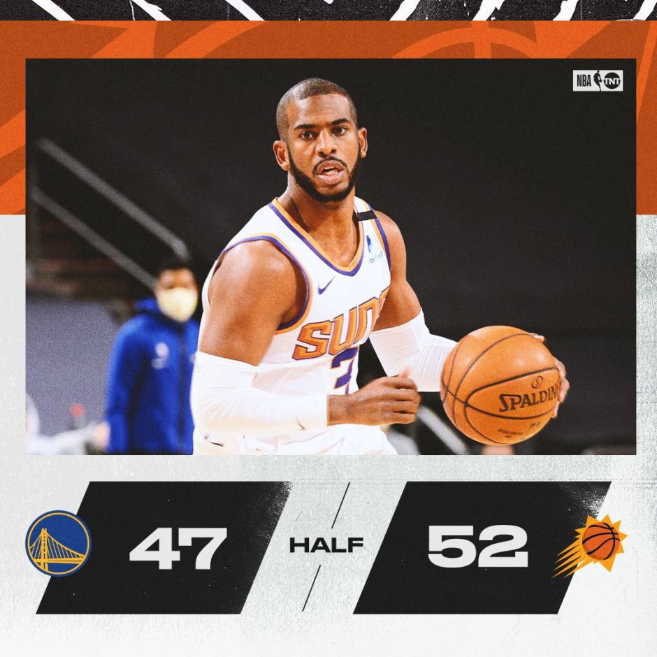 第三节,两队外线手感火热,克劳德和布里奇斯相继射进三分,而勇士方面库里爆发,一人连中两记三分并突破上篮得手,得到球队下半场前8分,卢尼空切篮下扣篮,克劳德连续在外线命中后帮助太阳将分差拉大到两位数,格林不满判罚吃T,库里突破打进高难度抛投,布里奇斯空切上篮得手。三节结束,太阳85-71领先勇士。