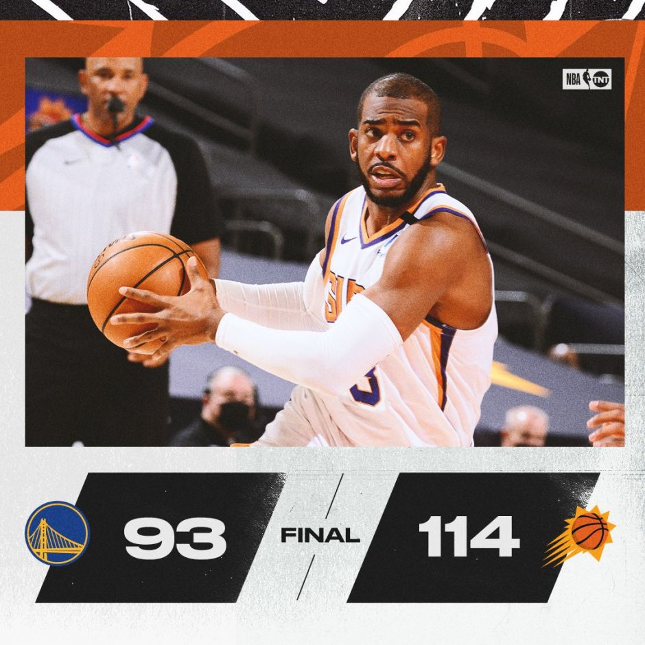 24直播网1月29日讯,2020-21赛季NBA常规赛火热进行,太阳主场迎战勇士,太阳遭遇三连败下滑至西部第9,而勇士最近双杀森林狼暂列西部第6,本场布克、萨里奇因伤缺战。比赛上来太阳就迅速进入状态,一波7-0的小高潮取得领先,保罗高效砍下9分,库里同样得到13分。次节勇士回敬一波攻势追上比分,但半场结束时太阳依旧领先着5分。易边再战, 太阳重新占据了场上的主动,分差也是被扩大到了20分以上,比赛失去悬念,最终太阳114-93大胜勇士,结束3连败。