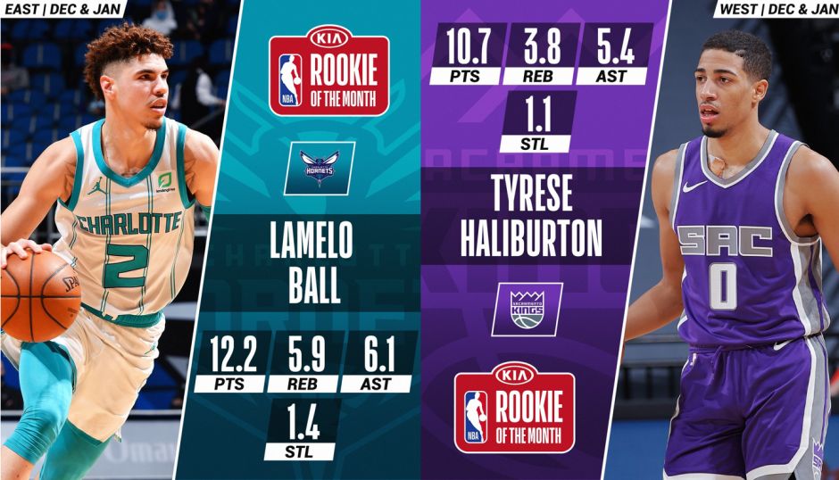 24直播网2月3日讯,2020-21赛季NBA常规赛,NBA官宣12月和1月东西部的月最佳新秀,由黄蜂探花秀拉梅洛-鲍尔和国王12号秀后卫哈利伯顿分别当选。