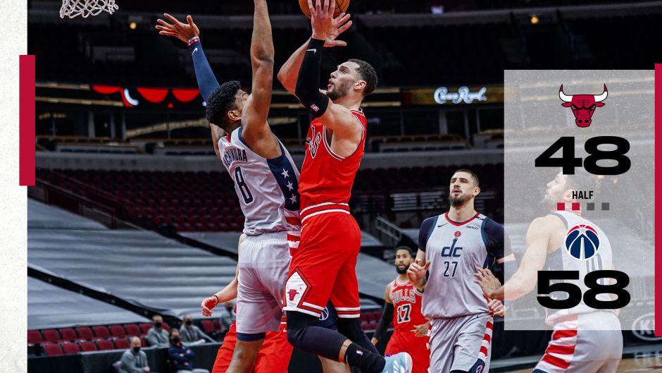 24直播网2月09日讯,2020-2021赛季NBA常规赛正在进行中,公牛对阵奇才,半场战罢,公牛以48-58暂时落后奇才10分。