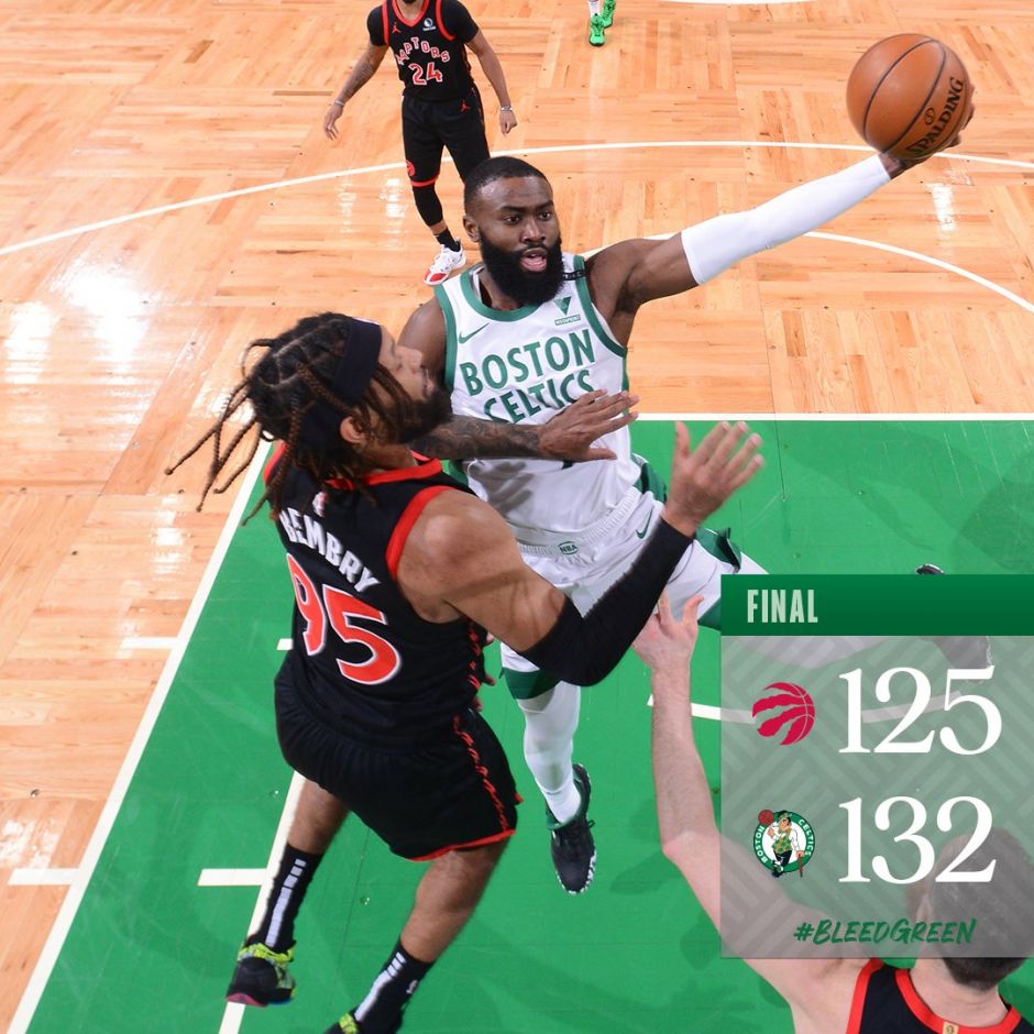 全场比赛结束,凯尔特人队以132-125领先猛龙队。塔图姆上场37分钟,15投9中,砍下27分12篮板5助攻2抢断;杰伦-布朗上场33分钟,11投4中,砍下21分7篮板4助攻1盖帽。
