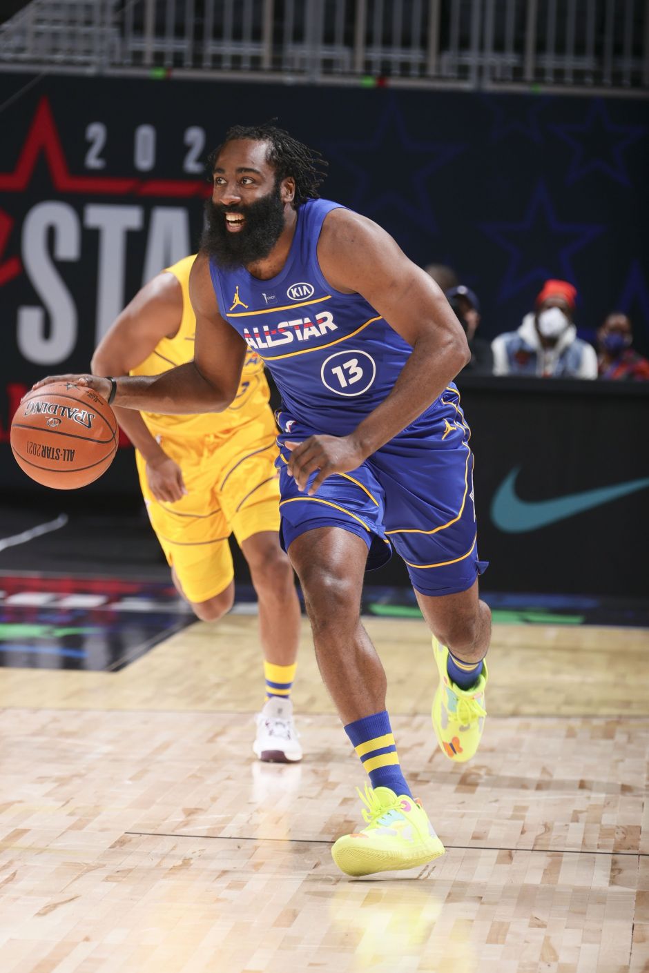 杜兰特队的詹姆斯-哈登表现出色,在替补出场的31分钟时间内,三分13中7砍下21分2篮板4助攻的数据。加上这7记三分,哈登的全明星三分命中总数来到了39,超越詹姆斯成为目前的全明星三分王!