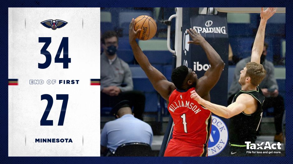 比赛开始,亚当斯放篮得手拿下全场首分,唐斯翻身跳投打成反击,锡安突破上篮得手,范德比尔特放篮打板命中。随后,找到手感的鹈鹕,打出一波16-2的攻势,将分差拉大至两位数。爱德华兹两罚止血,亚当斯两记中距离出手将分差拉大到16分。节末,森林狼打出一波7-0的小攻势追分,将分差缩小至个位数。随着里德的压哨三分不中,首节结束鹈鹕34-27领先森林狼7分。