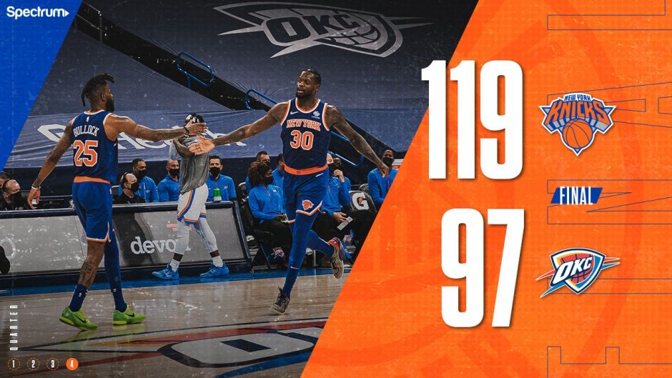 24直播网3月14日讯,2020-2021赛季NBA常规赛继续火热上演中,雷霆坐镇主场迎战尼克斯,在经过激烈的对战之后,尼克斯以119-97战胜雷霆。