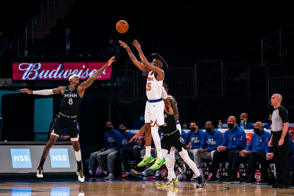 尼克斯首发阵容:伯克斯、RJ-巴雷特、埃尔弗里德-佩顿、米切尔-罗宾逊。