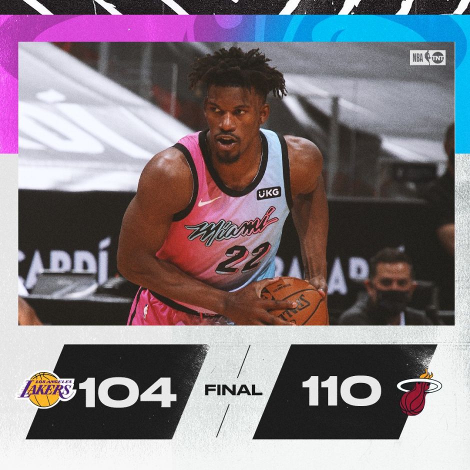 全场比赛结束,热火队以110-104击败湖人队。巴特勒上场35分钟,11投8中,砍下26分7篮板4助攻3抢断;奥拉迪波上场25分钟,8投5中,砍下18分4篮板2助攻1盖帽3抢断。