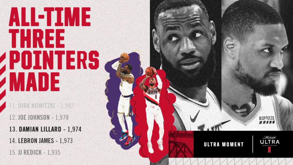 首节比赛中,利拉德投进一记三分后,个人生涯常规赛三分命中数来到1974个,超越詹姆斯(1973个)独占NBA历史第13,前面一位是乔-约翰逊(1978记)。
