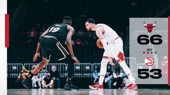 24直播网4月10日讯,2020-2021赛季NBA常规赛继续进行,老鹰对阵公牛,半场结束,公牛以66-53暂时领先老鹰。