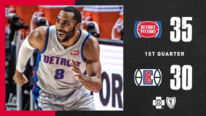 24直播网4月12日讯,2020-2021赛季NBA常规赛继续进行中,今日快船坐镇主场挑战活塞,首节结束,快船以30-35落后活塞5分。