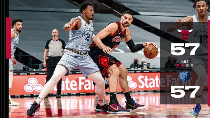 24直播网4月17日讯,2020-2021赛季NBA常规赛继续进行,公牛对阵灰熊,半场结束,公牛以57-57暂时战平灰熊。