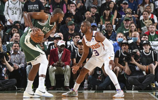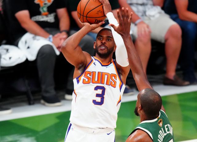 在总决赛G3战之前,保罗季后赛总得分已经来到2590分,排在季后赛历史第39位,距离达到2600分里程碑大关仅差10分。在布克此役进攻准星不佳情况下,保罗连投带传肩负起率队攻坚的任务,他在次节比赛就已经成功得分上双,屡屡用出色的中投杀伤雄鹿防守。