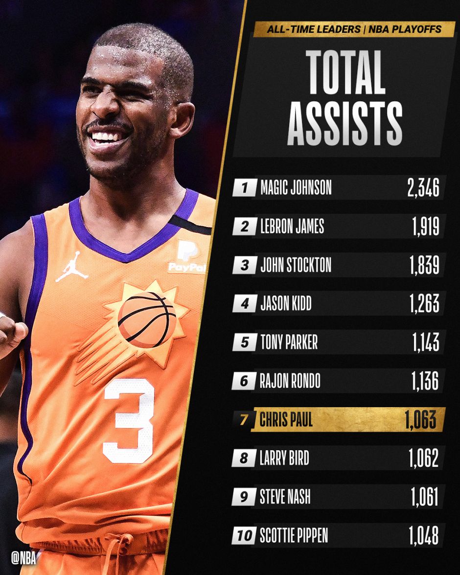 24直播网7月18日讯,2020-21赛季NBA总决赛,火热进行中,G5:太阳主场迎接雄鹿的挑战。 太阳核心控卫保罗,达成生涯历程碑,NBA职业生涯季后赛助攻数达1063,超越大鸟伯德成为历史第7! 恭喜保罗!