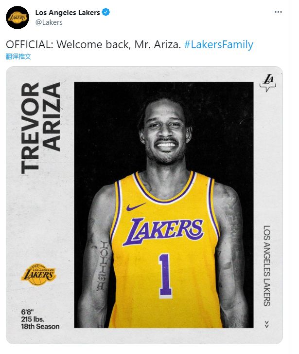 湖人官方推特写道:“欢迎回到湖人大家庭,阿里扎!”