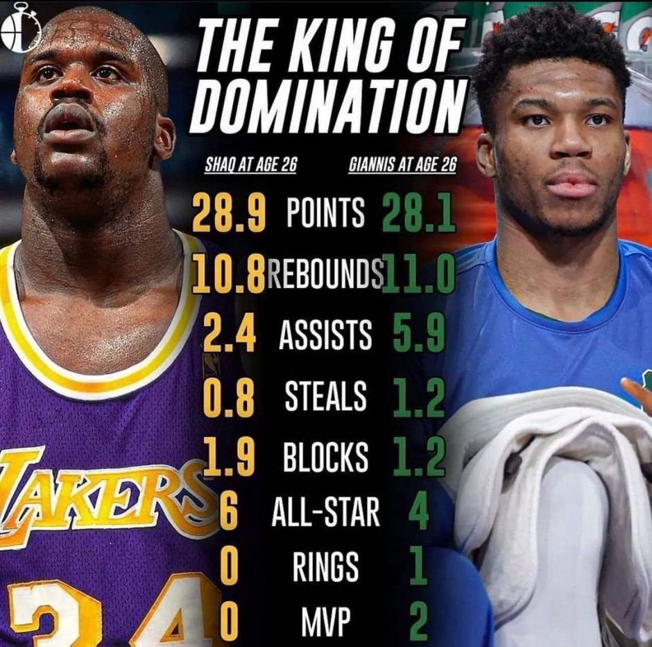 奥尼尔的的篮板数据与字母哥的数据平分秋色,但助攻与抢断数据中字母哥则占了上风,甚至冠军与MVP的数量也是超过了同期的奥尼尔的