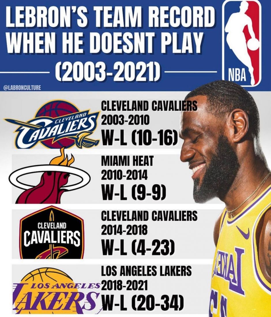 当詹姆斯缺席时,其所在球队战绩累计为43胜82负,胜率34.4%。