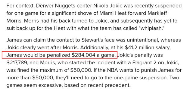 如果联盟对詹姆斯禁赛,他会有多大的经济损失?约基奇禁赛一场,损失了217789美元,而詹姆斯的年薪是4120万美元,他要是禁赛一场,损失更多,会达到284004美元。莫里斯被吹二级恶意,他被罚了50000美元,如果NBA想要罚詹姆斯超过5万美元,他们就需要对他禁赛一场。B/R指出,以詹姆斯这个案例的严重程度来说,最多是一场禁赛,两场就显得过分了。